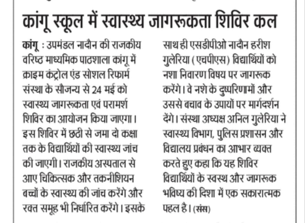 राजकीय वरिष्ठ माध्यमिक विद्यालय टयाला में स्वास्थ्य चिकित्सा शिविर का आयोजन