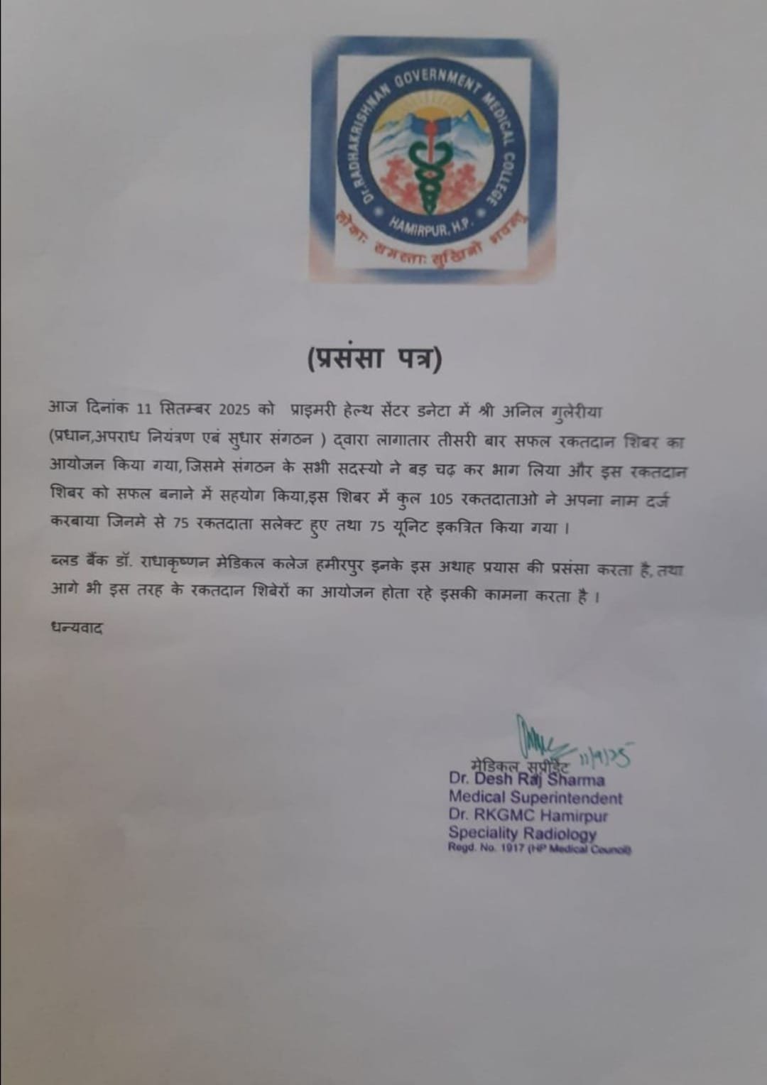 सफल रक्तदान शिविर के उपलक्ष पर सम्मान पत्र
